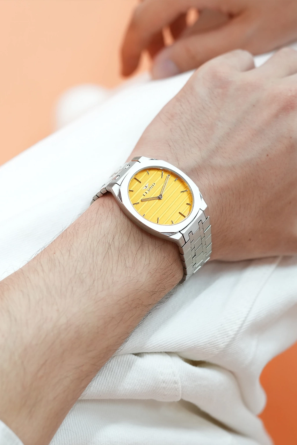 Paslanmaz çelikten üretilmiş bu şık model; sade ama dikkat çekici tasarımıyla her bilekte prestij sunar. Parlak yüzeyi ve sağlam yapısıyla hem görsel olarak güçlü hem de dayanıklı.