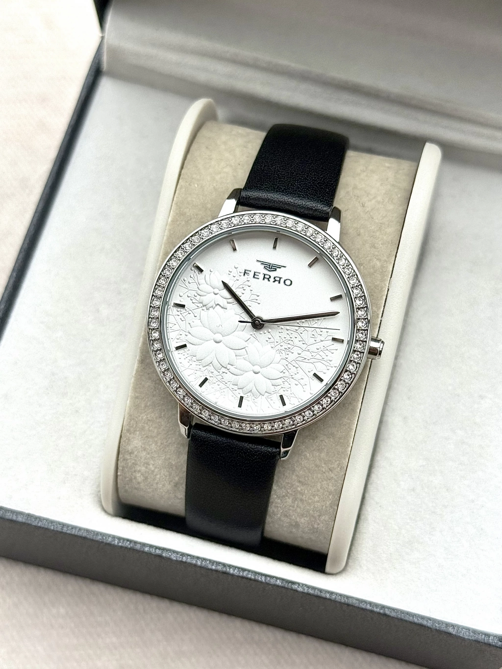 FERRO Ferro Gümüş Deri Kordon Kadın Kol Saati FL21242B-J 3 ATM Su Geçirmez 2 Yıl Garantili Hediye Paketli — Işıltılı Stil, Zarif Dokunuş
