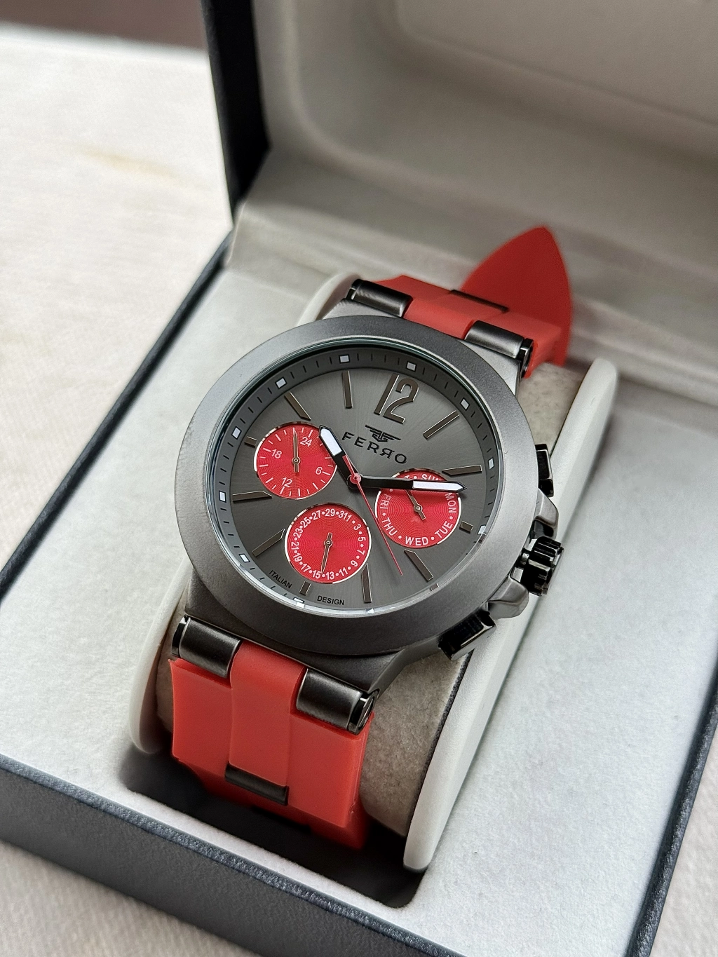 Japon Quartz Makine ile donatılmış olan Ferro Ferro Kırmızı Silikon Kordon Erkek Kol Saati FM11539DWT-ZK4 Fonksiyonları Aktif 3ATM Su Geçirmez, yüksek hassasiyetli zaman ölçümü sunar. Uzun ömürlü pil gücü ve sessiz çalışma performansıyla mükemmel bir deneyim yaşatır.