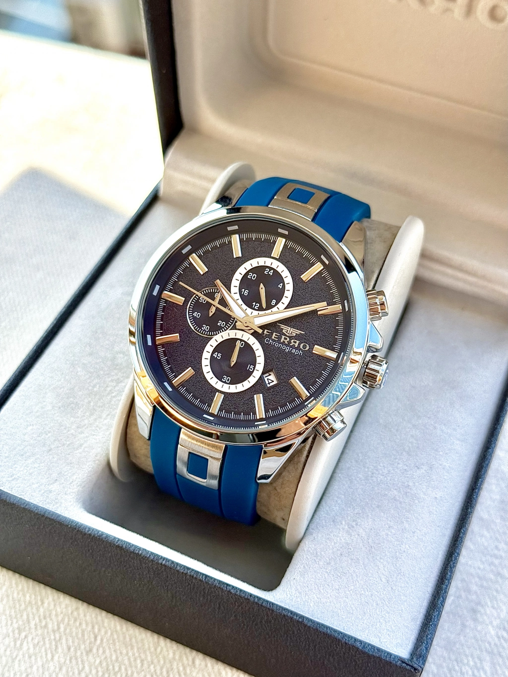 FERRO Ferro Lacivert Silikon Kordon Erkek Kol Saati FM31380D-L3 Tüm Fonksiyonlar Aktif 3 ATM Su Geçirmez — Işıltılı Stil, Zarif Dokunuş