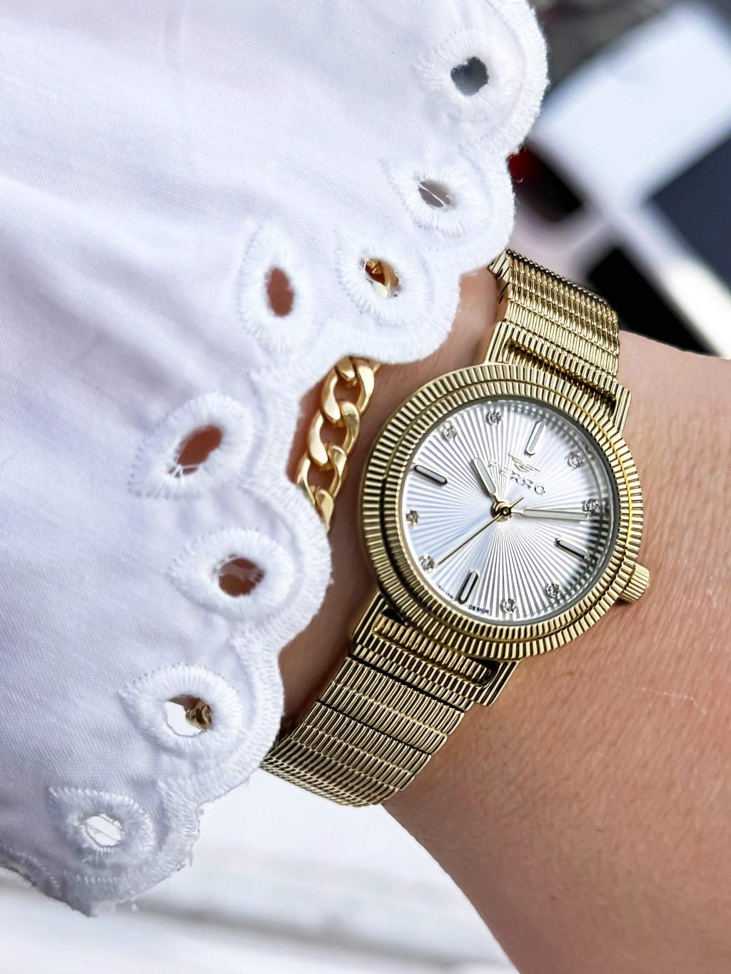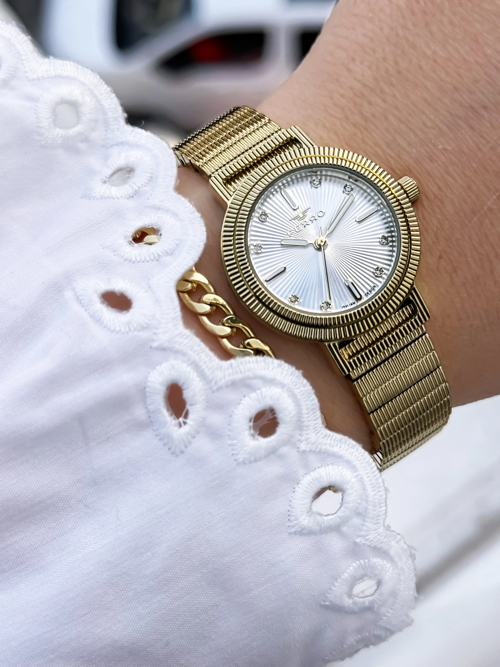 FERRO Ferro Sarı Çelik Kordon Kadın Kol Saati FL40149A-B 3ATM Su Geçirmez 2 Yıl Garantili HediyePaketli — Işıltılı Stil, Zarif Dokunuş