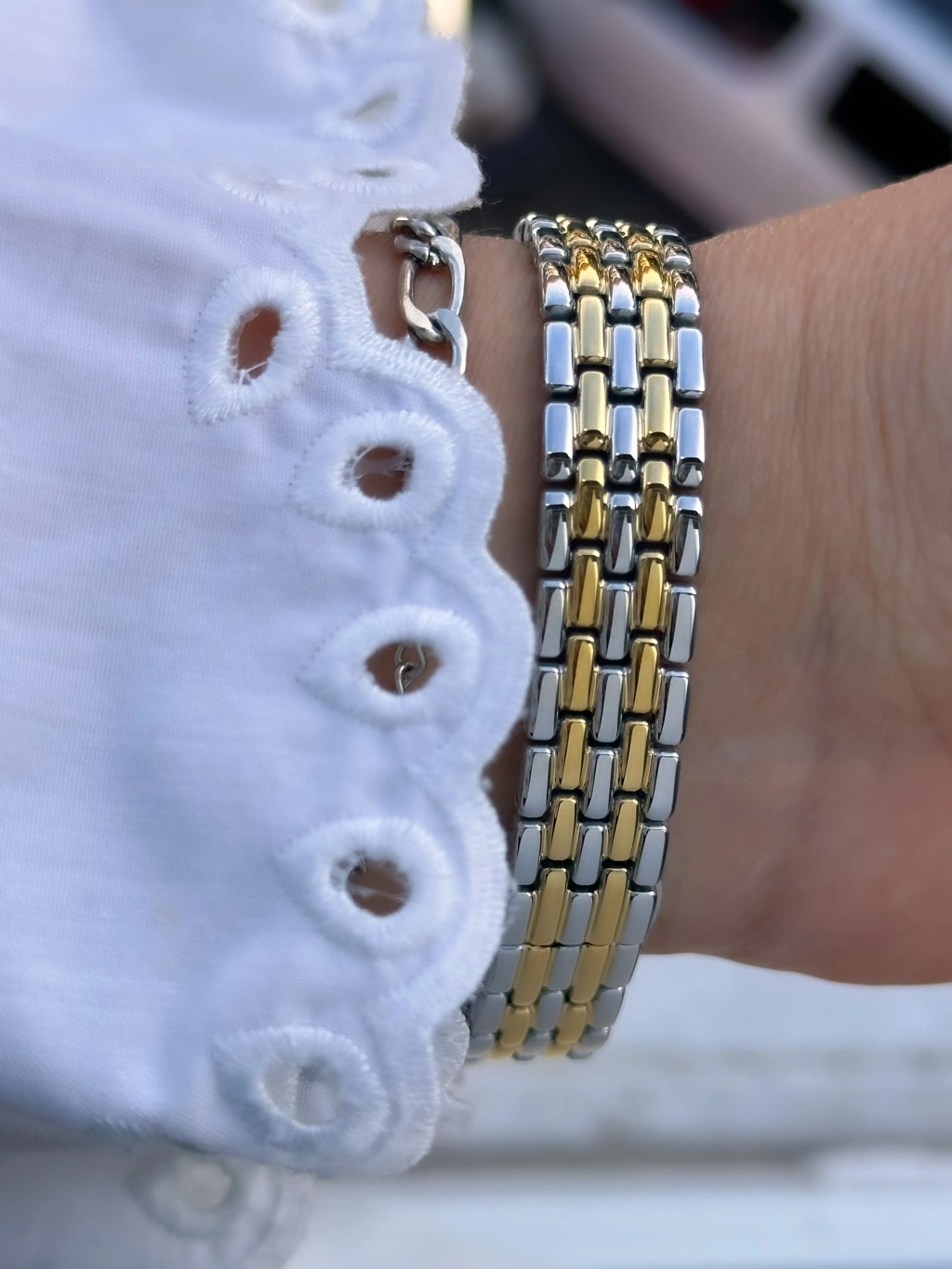 Paslanmaz çelikten üretilmiş bu şık model; sade ama dikkat çekici tasarımıyla her bilekte prestij sunar. Parlak yüzeyi ve sağlam yapısıyla hem görsel olarak güçlü hem de dayanıklı.