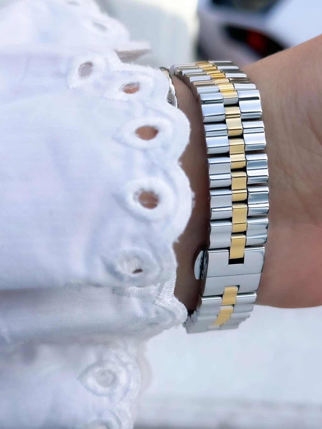 Paslanmaz çelikten üretilmiş bu şık model; sade ama dikkat çekici tasarımıyla her bilekte prestij sunar. Parlak yüzeyi ve sağlam yapısıyla hem görsel olarak güçlü hem de dayanıklı.