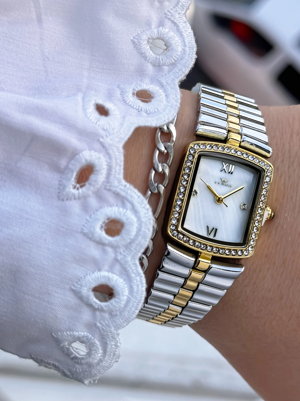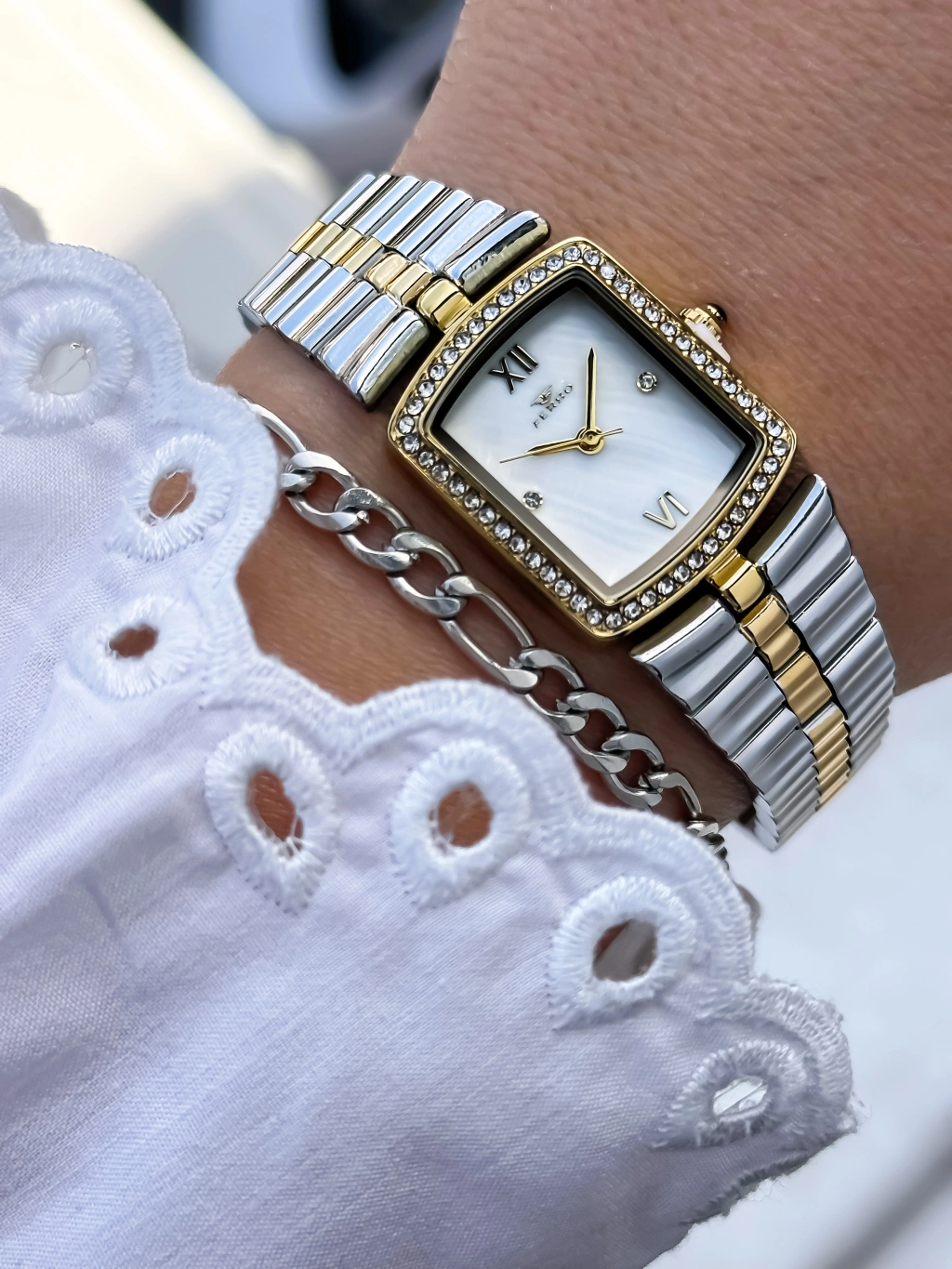 FERRO Ferro Sarı ve Gümüş Çelik Kordon Kadın Kol Saati FL88744A-D 3 ATM Su Geçirmez 2 Yıl Garantili Hediye Paketli — Işıltılı Stil, Zarif Dokunuş