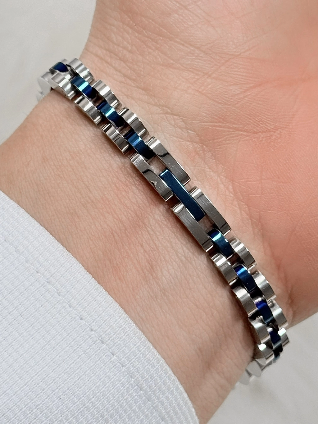 Paslanmaz çelikten üretilmiş bu şık model; sade ama dikkat çekici tasarımıyla her bilekte prestij sunar. Parlak yüzeyi ve sağlam yapısıyla hem görsel olarak güçlü hem de dayanıklı.