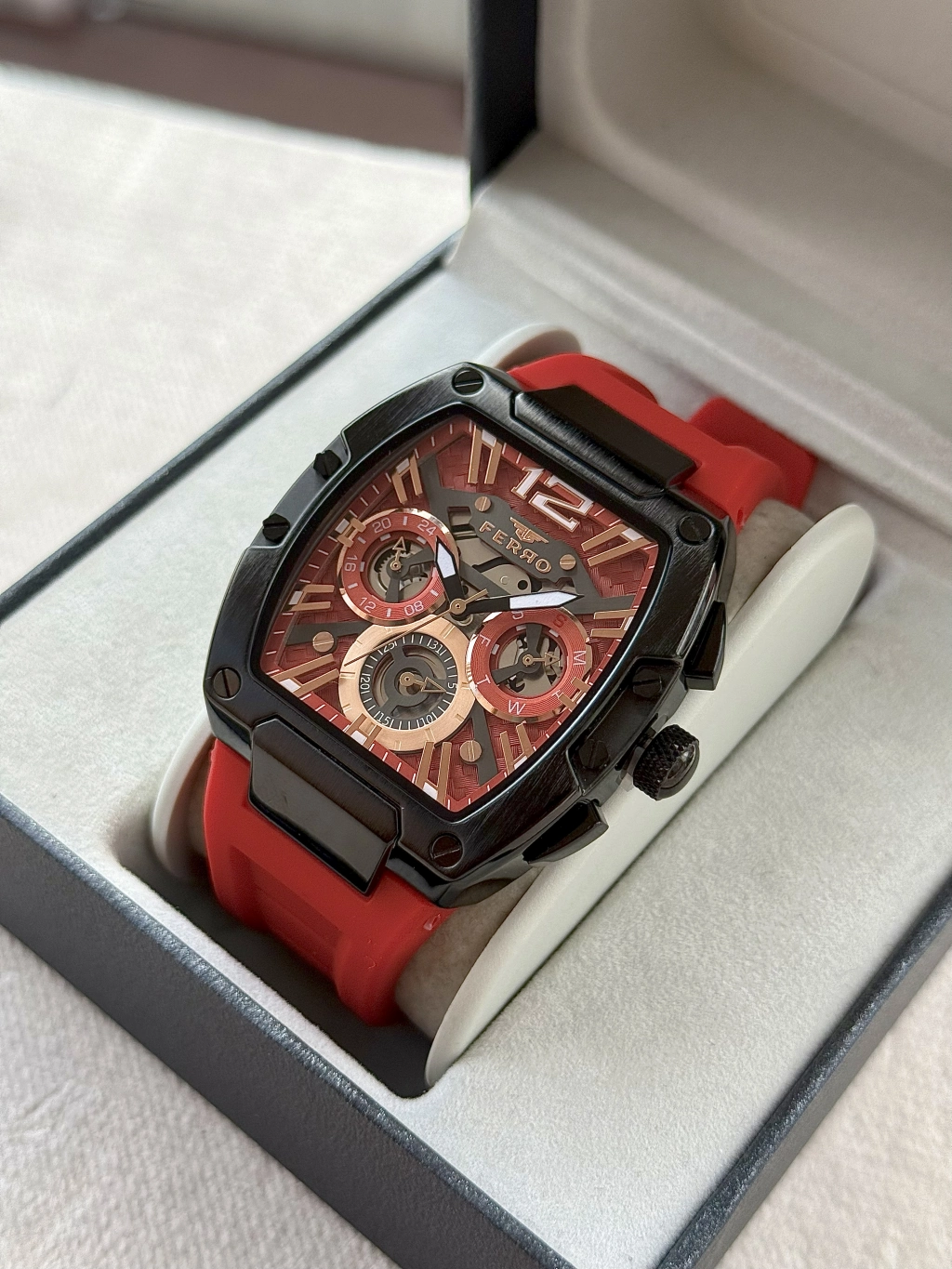 FERRO Ferro Kırmızı Silikon Kordon Erkek Kol Saati FM11527DWT-ZJ8 Fonksiyonları Aktif 3ATM Su Geçirmez — Işıltılı Stil, Zarif Dokunuş