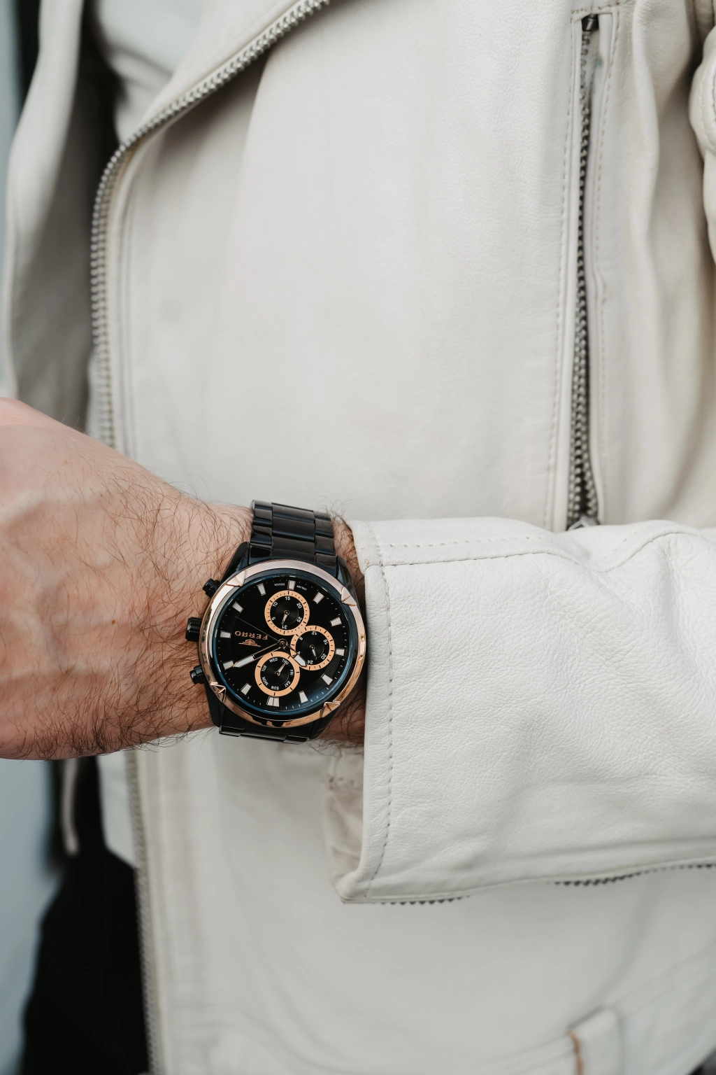 FERRO Ferro Siyah Çelik Kordon Erkek Kol Saati FM11388A-R2 Fonksiyonları Aktif 3ATM Su Geçirmez — Işıltılı Stil, Zarif Dokunuş