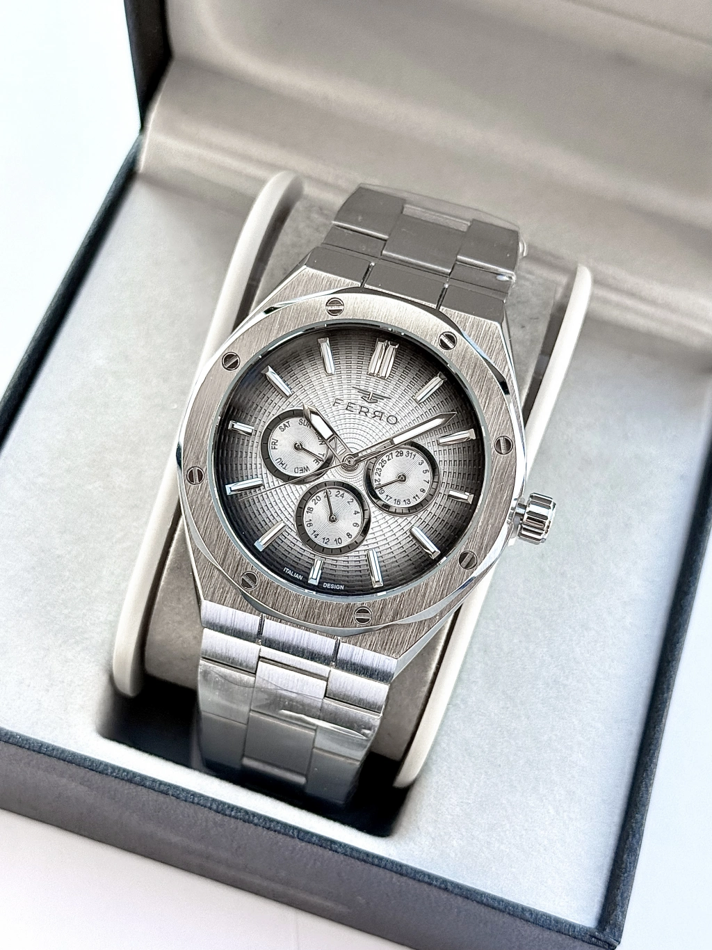 Japon Quartz Makine ile donatılmış olan Ferro Ferro Gümüş Çelik Kordon Erkek Kol Saati FM11537AWT-A2 Fonksiyonları Aktif 3ATM Su Geçirmez, yüksek hassasiyetli zaman ölçümü sunar. Uzun ömürlü pil gücü ve sessiz çalışma performansıyla mükemmel bir deneyim yaşatır.
