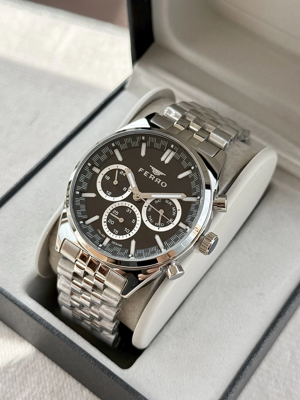 FERRO Ferro Gümüş Çelik Kordon Erkek Kol Saati FM11647A-A2 Fonksiyonları Aktif 3 ATM Su Geçirmez — Işıltılı Stil, Zarif Dokunuş