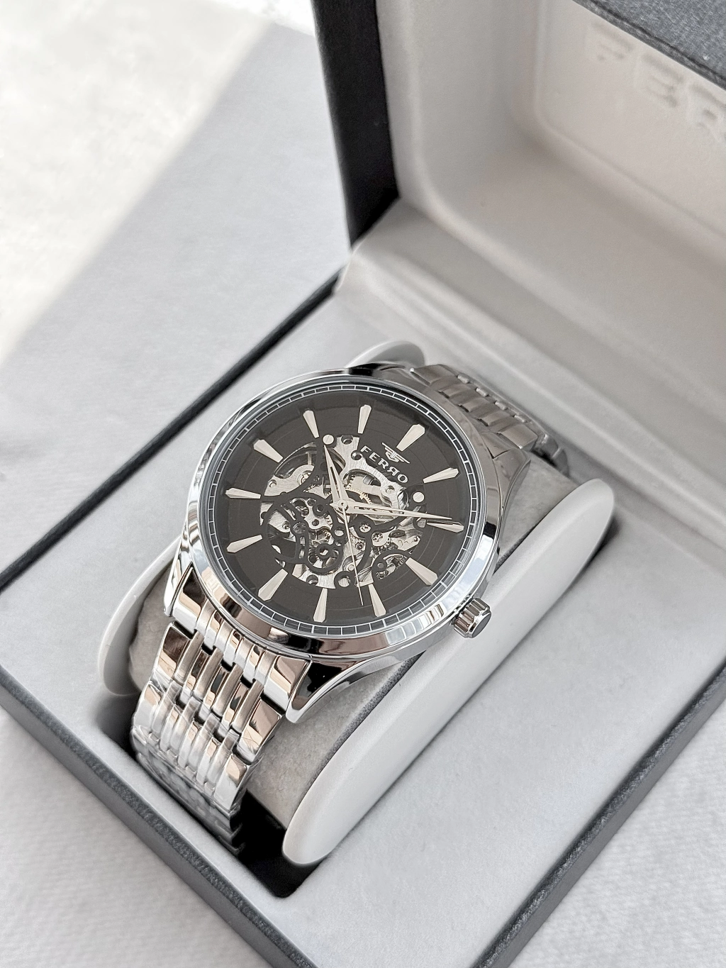 FERRO Ferro Gümüş Çelik Kordon Erkek Kol Saati FM31440A-A2 Otomatik Makine 3 ATM Su Geçirmez Hediye Paketli — Işıltılı Stil, Zarif Dokunuş