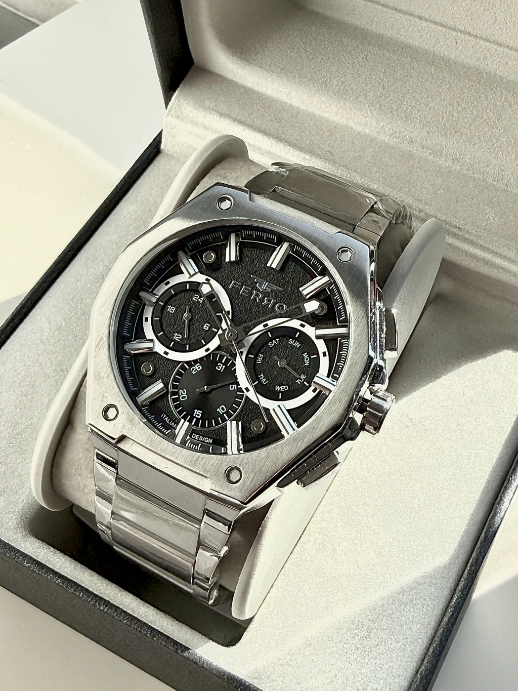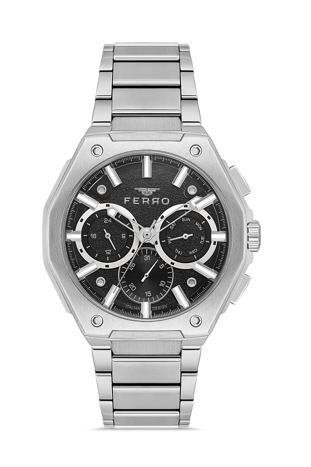 FERRO Ferro Gümüş Çelik Kordon Erkek Kol Saati FM43023AWT-A2 Tüm Fonksiyonlar Aktif 3ATM Su Geçirmez — Işıltılı Stil, Zarif Dokunuş