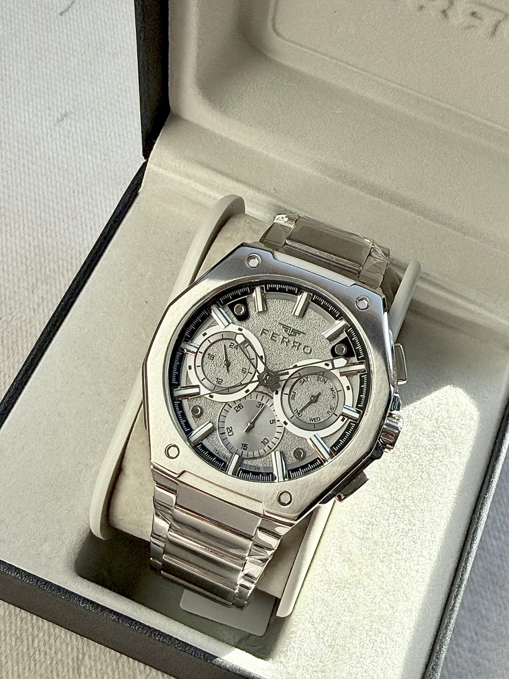 FERRO Ferro Gümüş Çelik Kordon Erkek Kol Saati FM43023AWT-A4 Tüm Fonksiyonlar Aktif 3ATM Su Geçirmez — Işıltılı Stil, Zarif Dokunuş