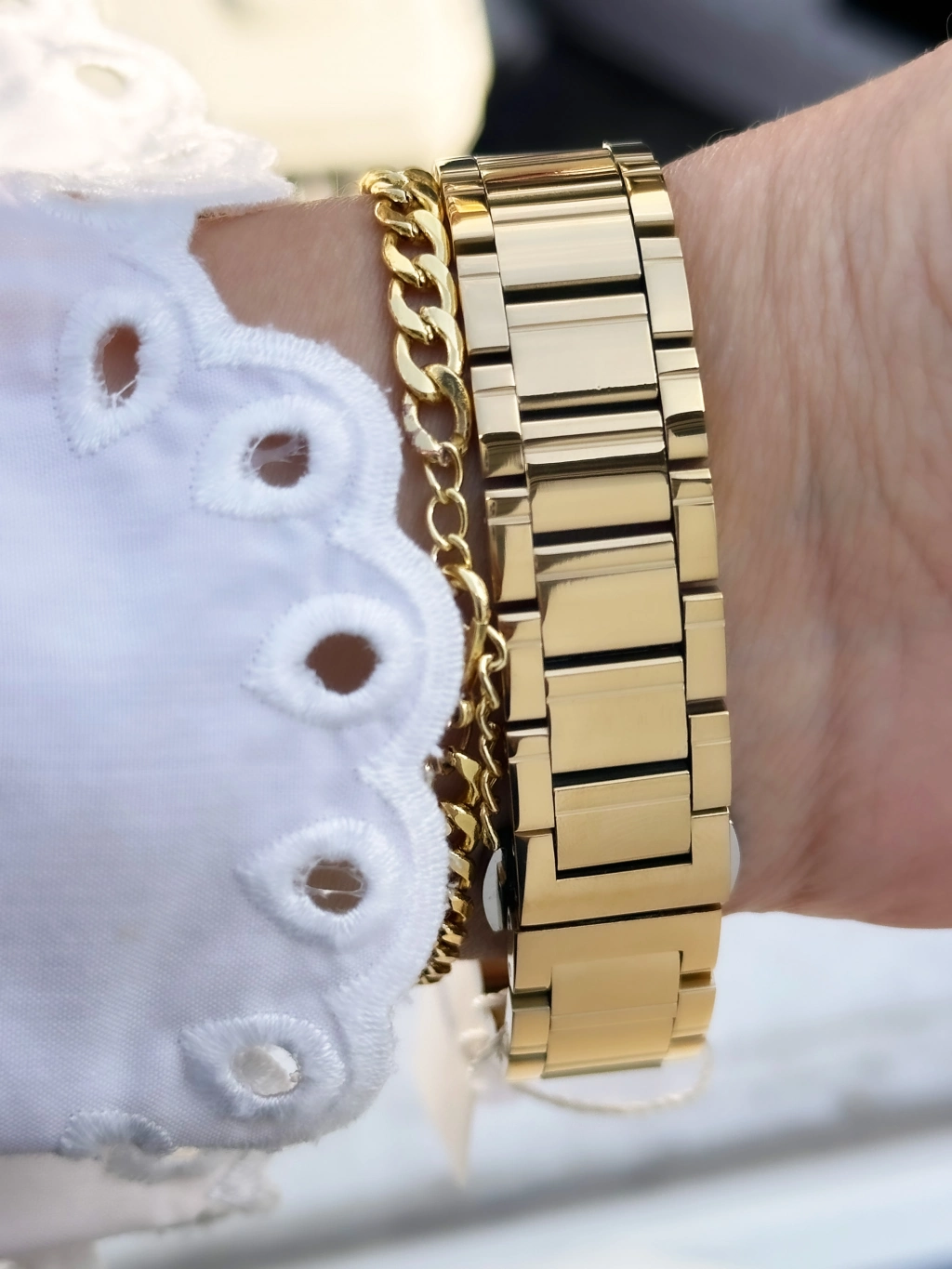 Paslanmaz çelikten üretilmiş bu şık model; sade ama dikkat çekici tasarımıyla her bilekte prestij sunar. Parlak yüzeyi ve sağlam yapısıyla hem görsel olarak güçlü hem de dayanıklı.