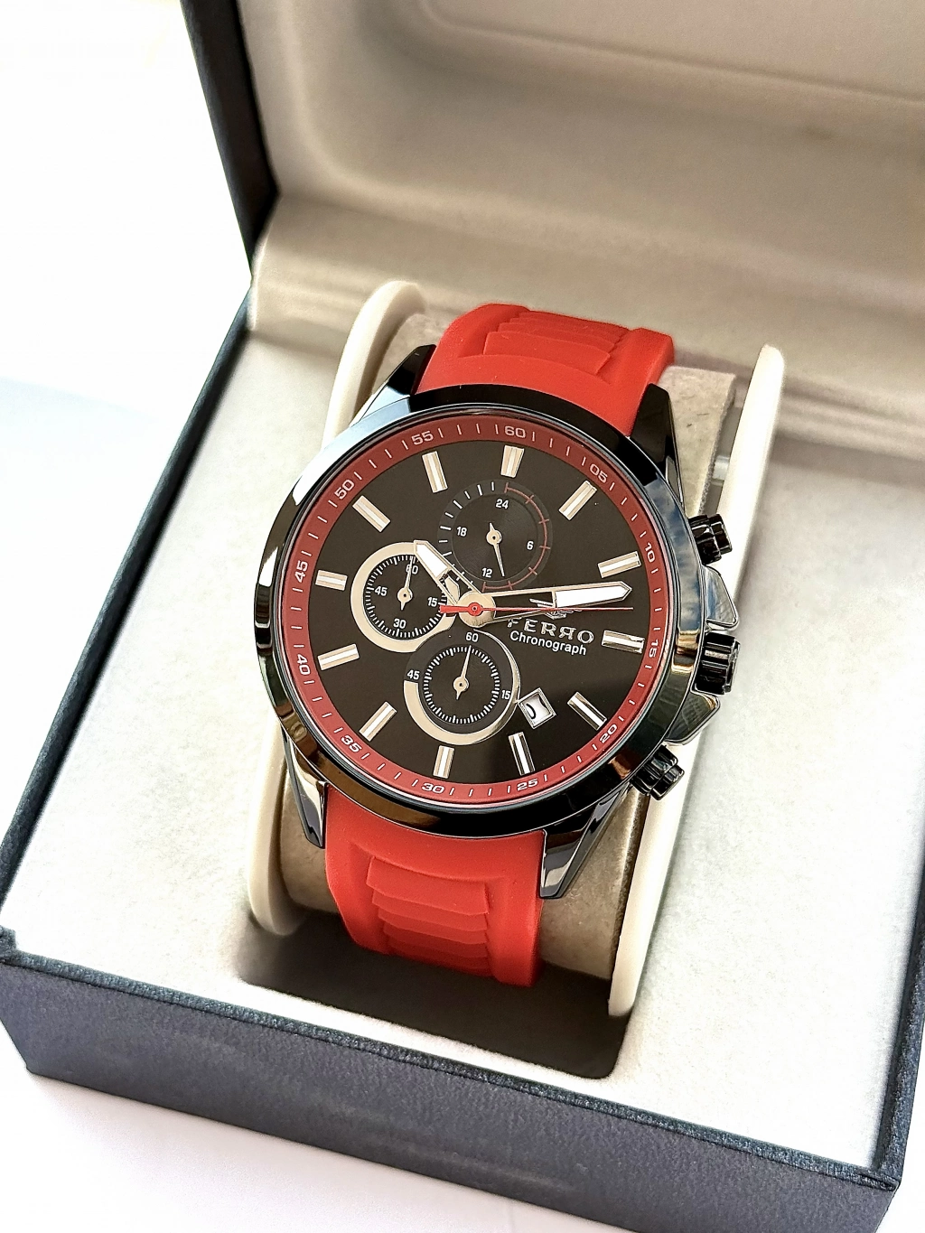 Japon Quartz Makine ile donatılmış olan Ferro Ferro Kırmızı Silikon Kordon Erkek Kol Saati FM31359D-GR Tüm Fonksiyonları Aktif 3 ATM Su Geçirmez, yüksek hassasiyetli zaman ölçümü sunar. Uzun ömürlü pil gücü ve sessiz çalışma performansıyla mükemmel bir deneyim yaşatır.