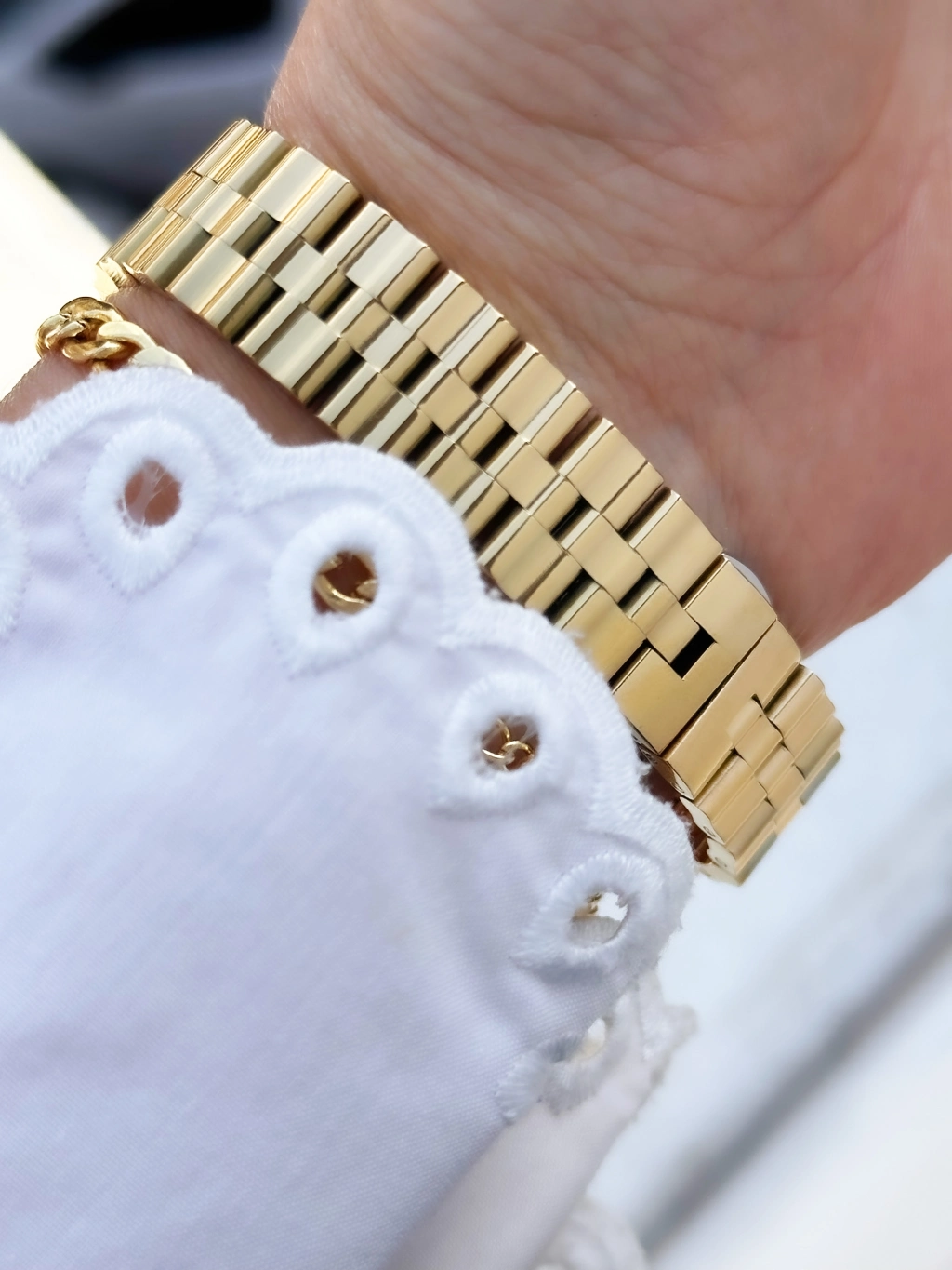 Paslanmaz çelikten üretilmiş bu şık model; sade ama dikkat çekici tasarımıyla her bilekte prestij sunar. Parlak yüzeyi ve sağlam yapısıyla hem görsel olarak güçlü hem de dayanıklı.