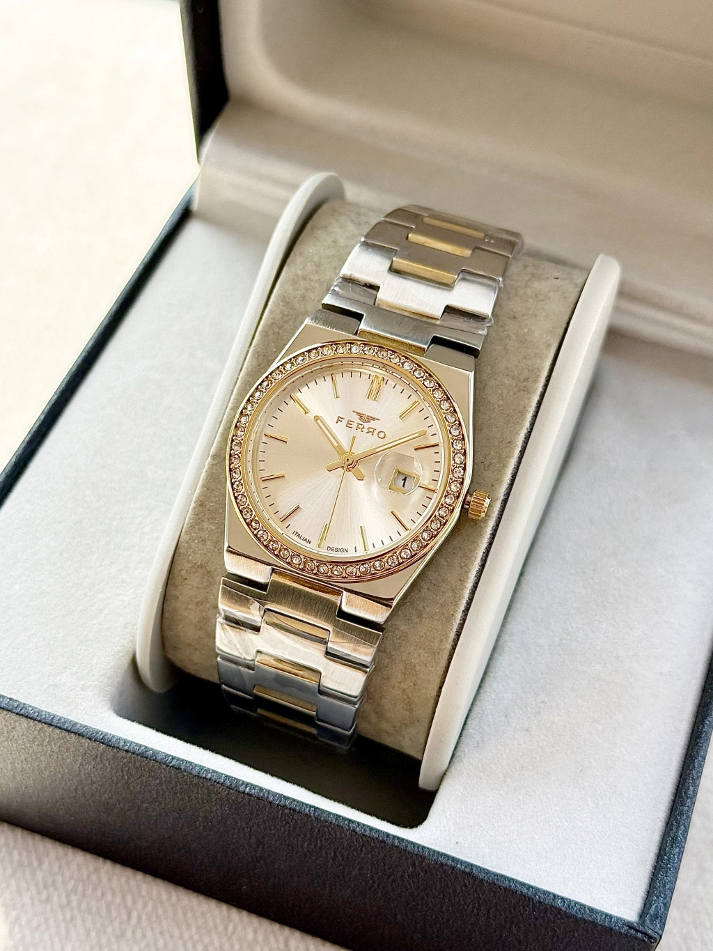 FERRO Ferro Sarı ve Gümüş Çelik Kordon Kadın Kol Saati FL21596AWT-D 3ATM Su Geçirmez 2 Yıl Garantili — Işıltılı Stil, Zarif Dokunuş