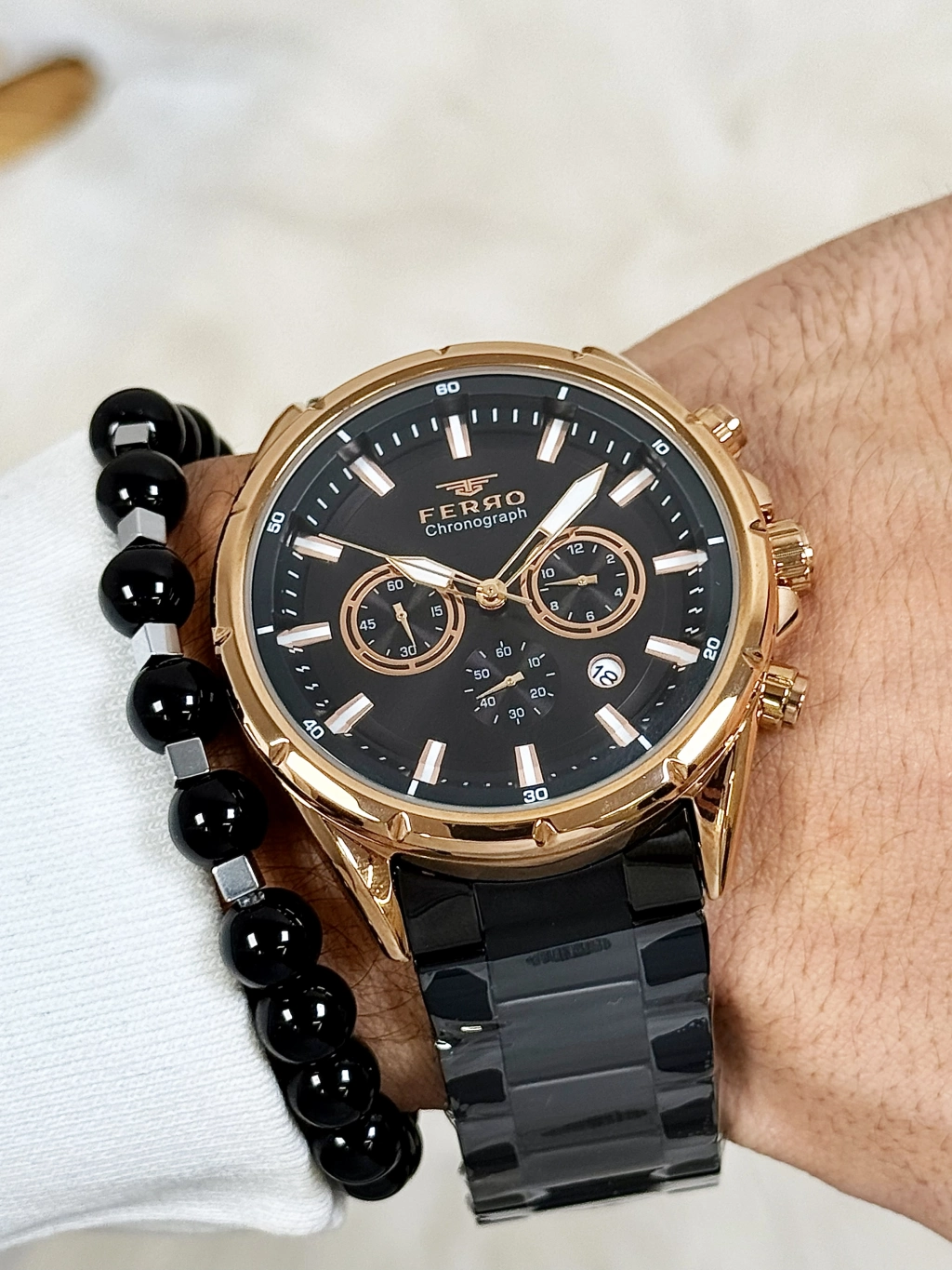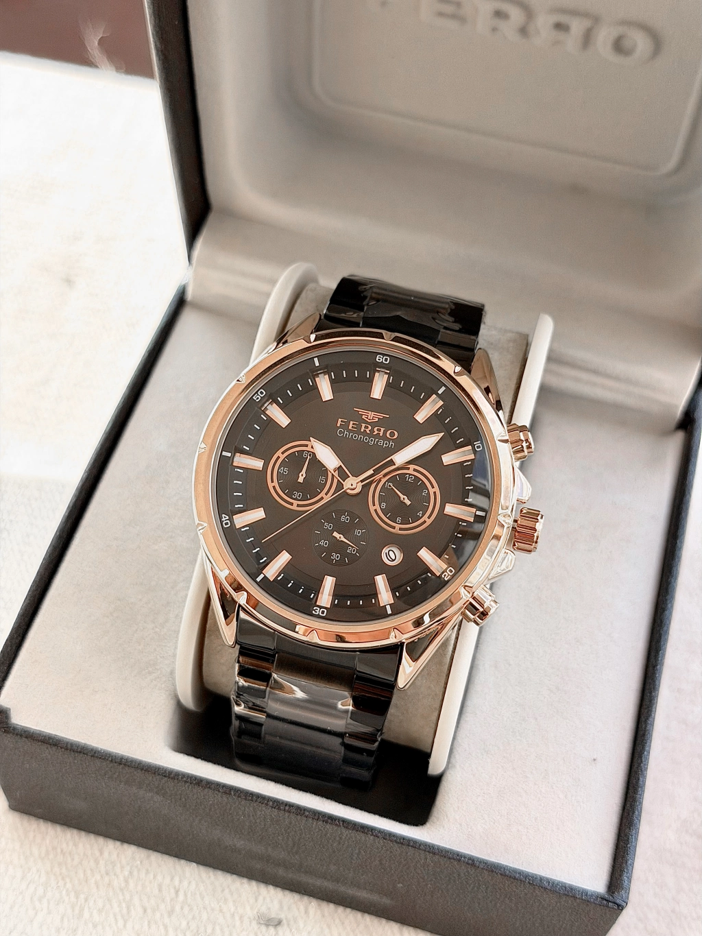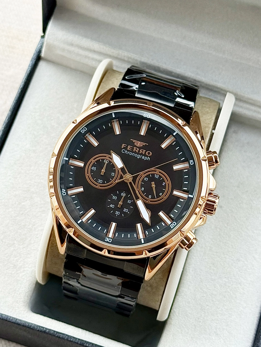 FERRO Ferro Siyah Çelik Kordon Erkek Kol Saati FM31291A-R Tüm Fonksiyonları Aktif 3 ATM Su Geçirmez — Işıltılı Stil, Zarif Dokunuş