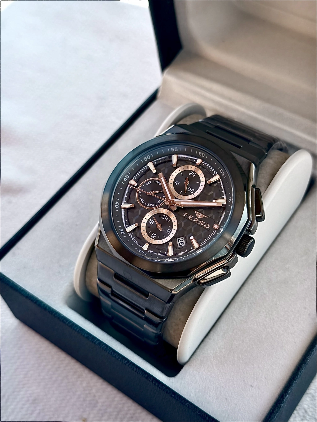 FERRO Ferro Siyah Çelik Kordon Erkek Kol Saati FM43024A-V Tüm Fonksiyonlar Aktif 3ATM Su Geçirmez — Işıltılı Stil, Zarif Dokunuş