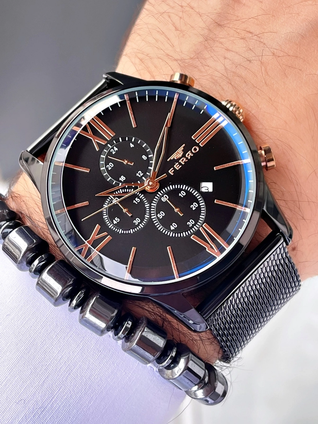 Ferro Siyah Hasır Kordon Erkek Kol Saati FM1536C-G Tüm Fonksiyonları Aktif 3 ATM Su Geçirmez , modern çizgileriyle şıklığı ve dayanıklılığı bir araya getirir. Her detayı özenle tasarlanan Ferro saatler, güçlü duruşu ve zamansız tasarımıyla tarzınızı tamamlar. Gündelik kullanımda, iş hayatında veya özel davetlerde her anınıza eşlik edecek kusursuz bir aksesuardır.