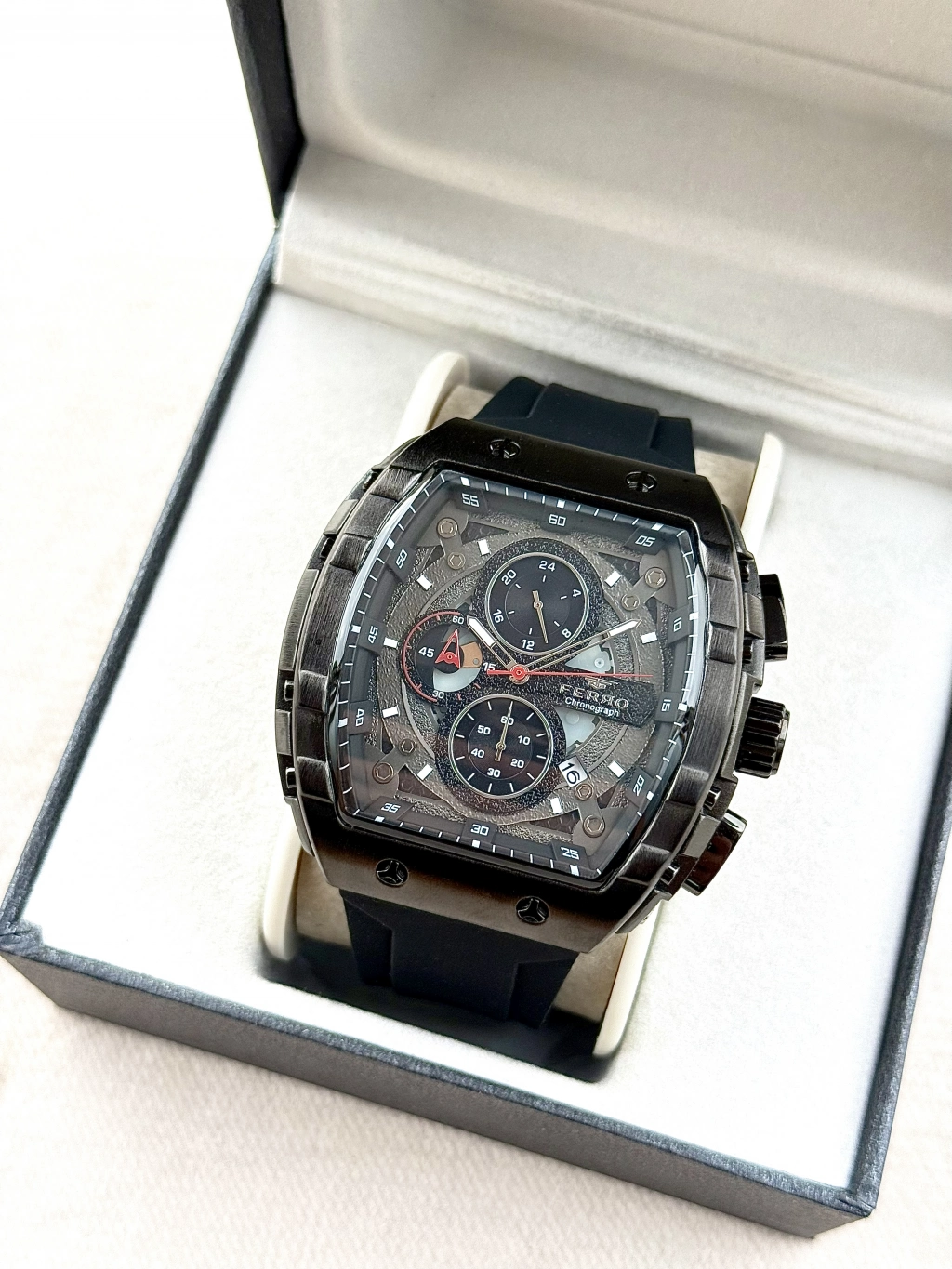 FERRO Ferro Siyah Silikon Kordon Erkek Kol Saati FM31346D-G Tüm Fonksiyonları Aktif 3 ATM Su Geçirmez — Işıltılı Stil, Zarif Dokunuş