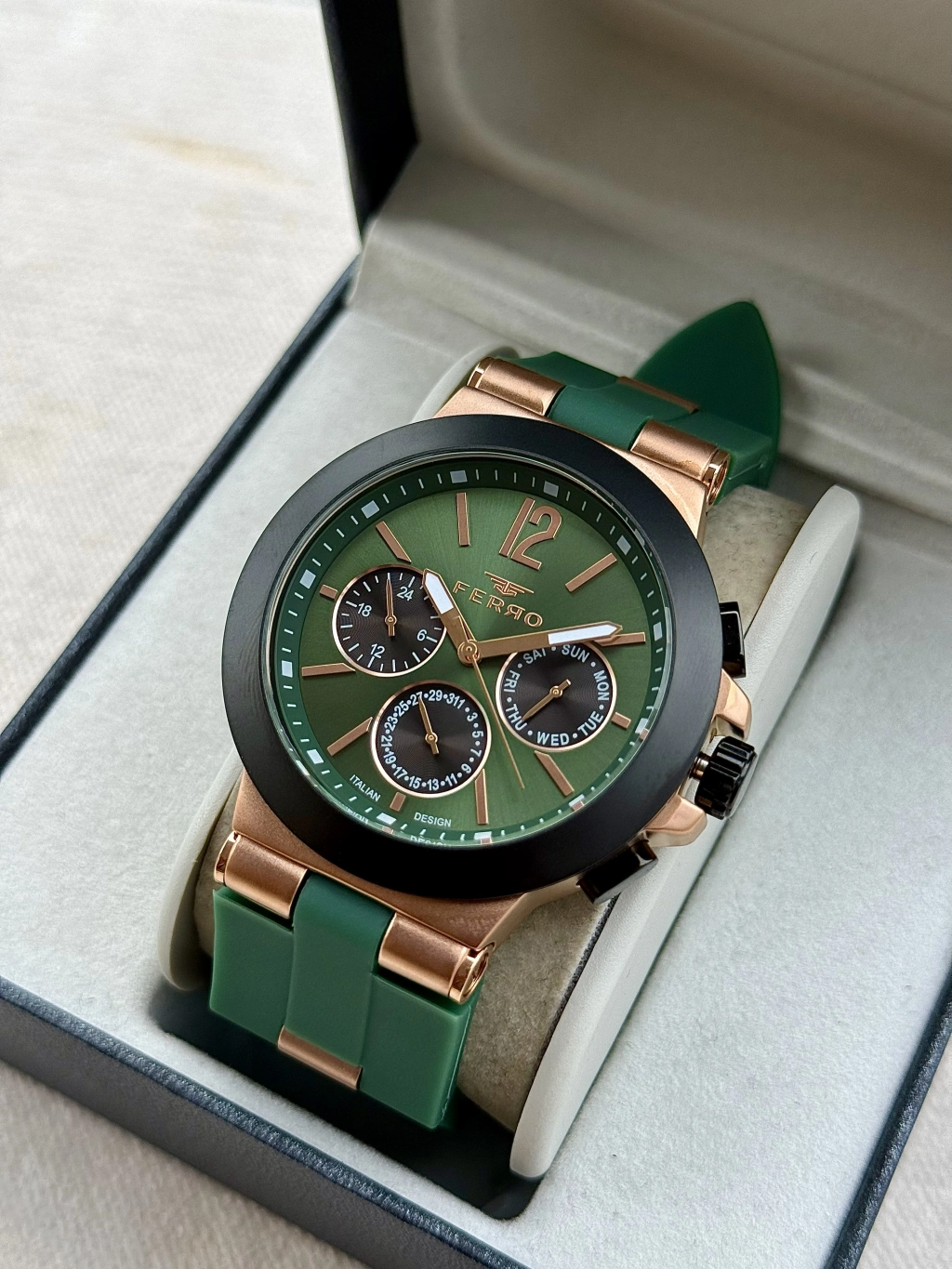 FERRO Ferro Yeşil Silikon Kordon Erkek Kol Saati FM11539DWT-ZQ6 Fonksiyonları Aktif 3ATM Su Geçirmez — Işıltılı Stil, Zarif Dokunuş