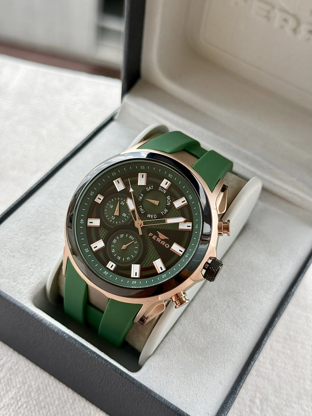FERRO Ferro Yeşil Silikon Kordon Erkek Kol Saati FM31402D-R10 Tüm Fonksiyonlar Aktif 3 ATM Su Geçirmez — Işıltılı Stil, Zarif Dokunuş