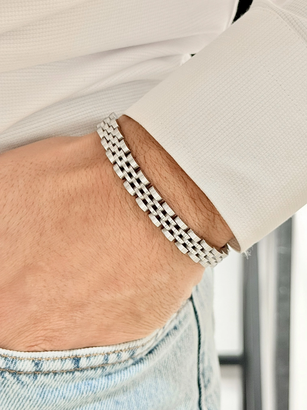 Paslanmaz çelikten üretilmiş bu şık model; sade ama dikkat çekici tasarımıyla her bilekte prestij sunar. Parlak yüzeyi ve sağlam yapısıyla hem görsel olarak güçlü hem de dayanıklı.