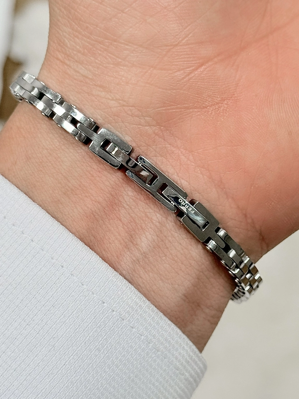 Paslanmaz çelikten üretilmiş bu şık model; sade ama dikkat çekici tasarımıyla her bilekte prestij sunar. Parlak yüzeyi ve sağlam yapısıyla hem görsel olarak güçlü hem de dayanıklı.