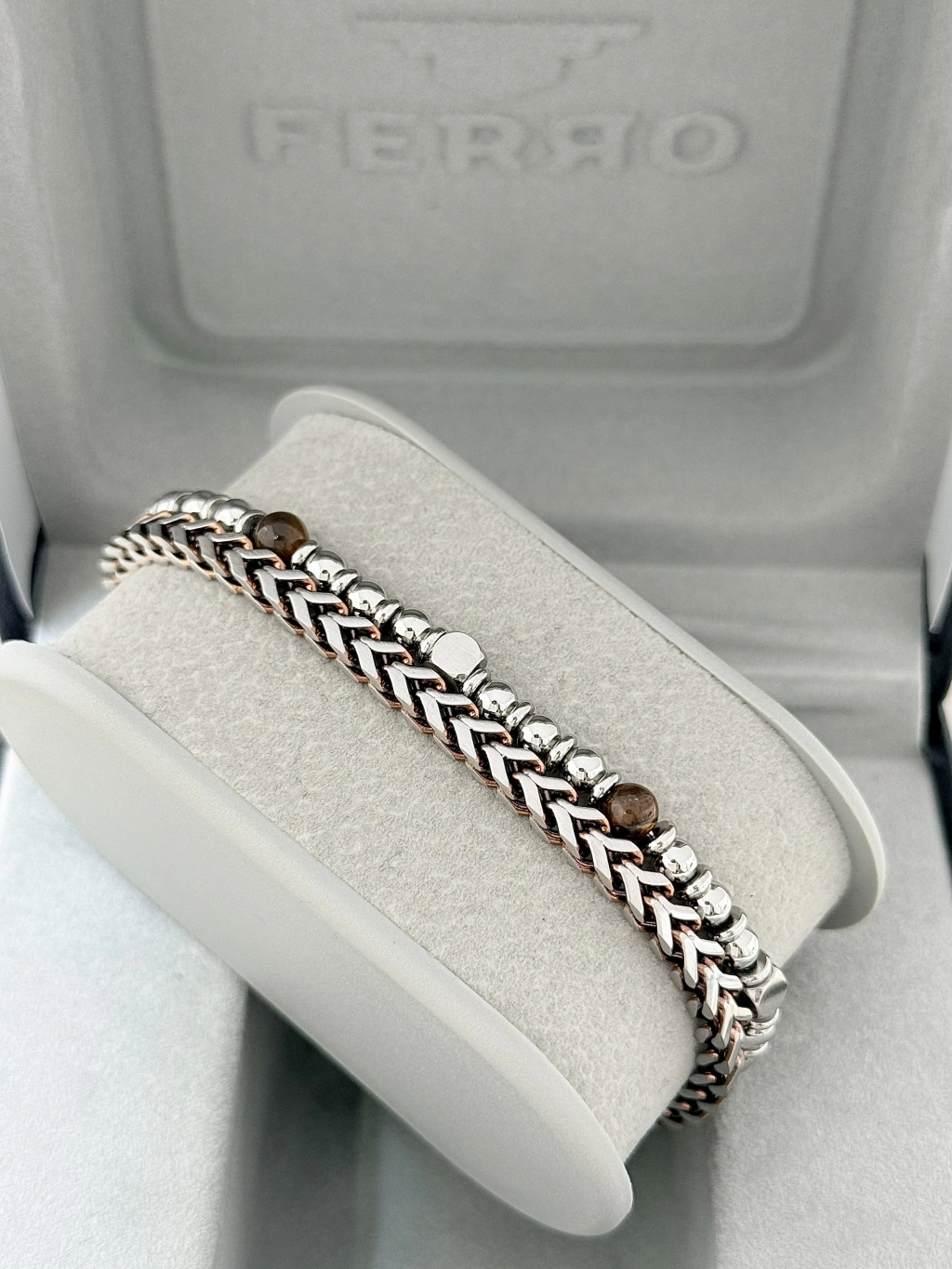 FERRO Gümüş ve Kahverengi Çelik Erkek Bileklik FRJ10114A-E 2 Yıl Garantili Hediye Paketli — Işıltılı Stil, Zarif Dokunuş