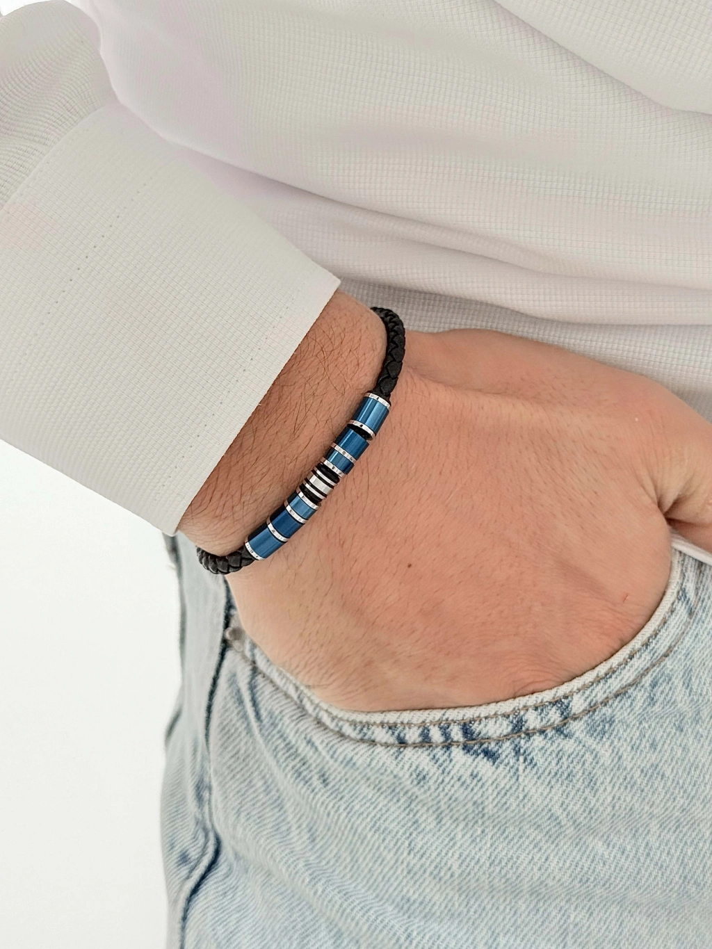 FERRO Lacivert ve Gümüş Çelik Deri Erkek Bileklik FRJ10191B-L 2 Yıl Garantili Hediye Paketli — Işıltılı Stil, Zarif Dokunuş