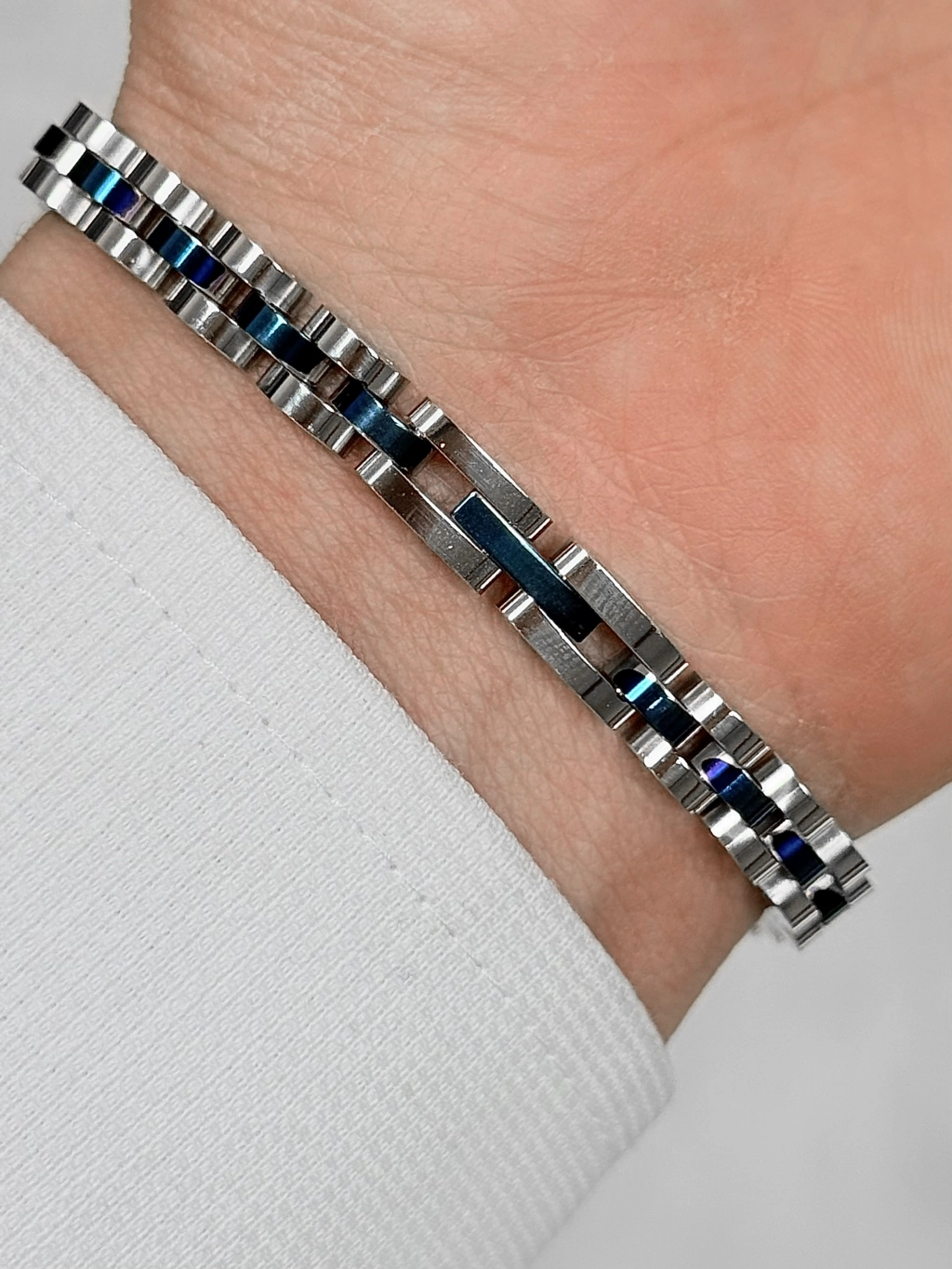 Paslanmaz çelikten üretilmiş bu şık model; sade ama dikkat çekici tasarımıyla her bilekte prestij sunar. Parlak yüzeyi ve sağlam yapısıyla hem görsel olarak güçlü hem de dayanıklı.