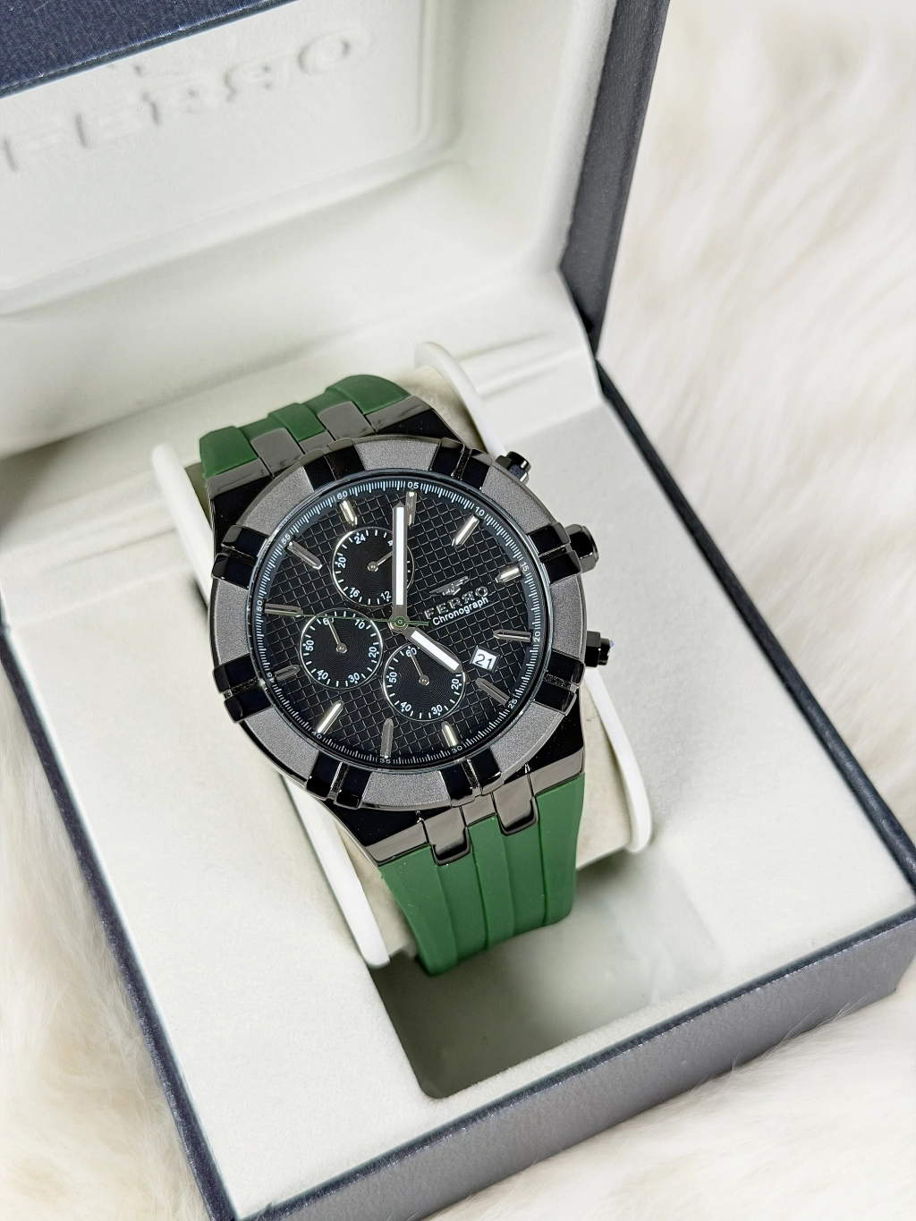Japon Quartz Makine ile donatılmış olan Ferro Ferro Yeşil Çelik Kordon Erkek Kol Saati FM11378D-ZQ2 Fonksiyonları Aktif 3ATM Su Geçirmez, yüksek hassasiyetli zaman ölçümü sunar. Uzun ömürlü pil gücü ve sessiz çalışma performansıyla mükemmel bir deneyim yaşatır.