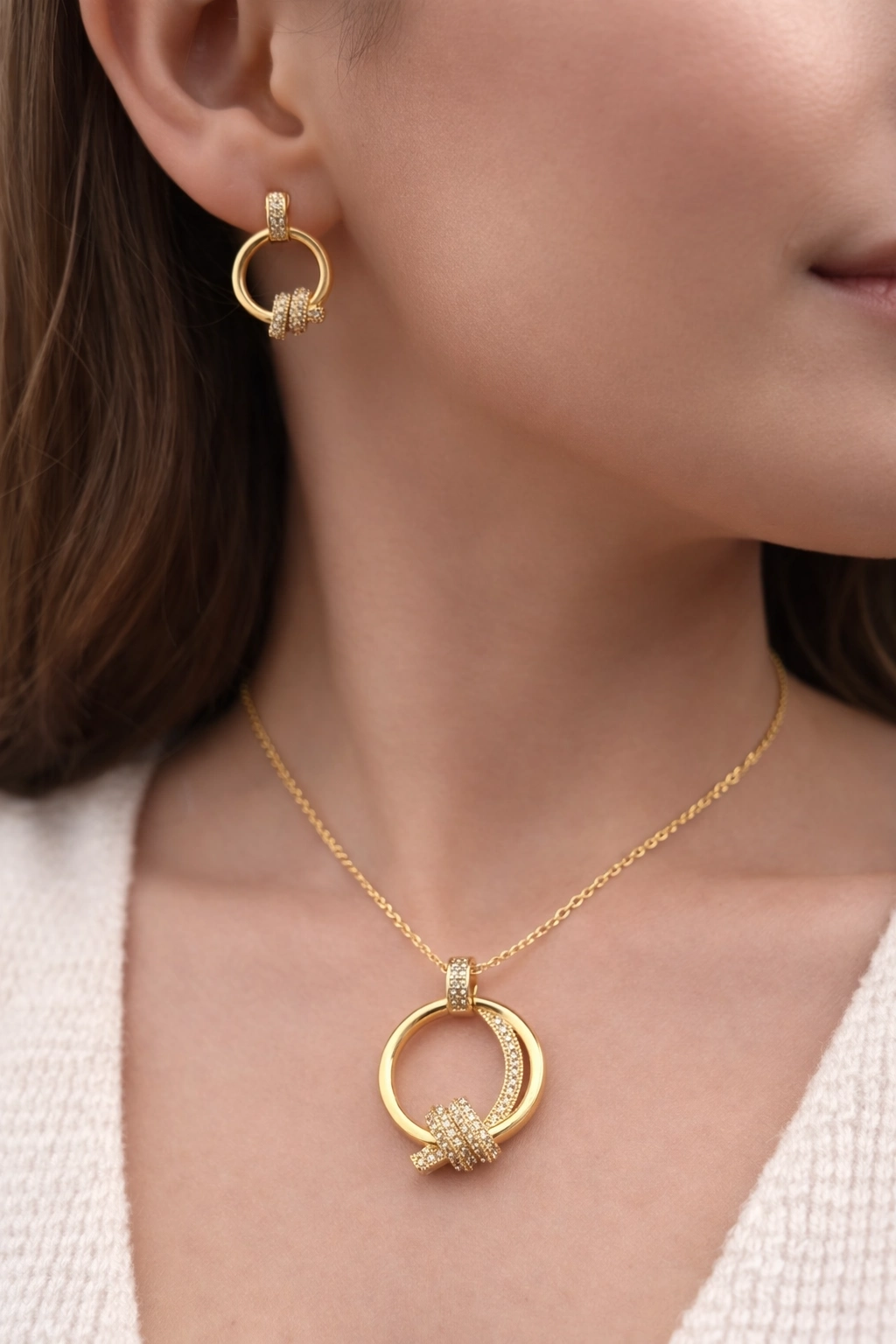 FERRO Sarı Çelik Kadın Küpe ve Kolye Set FRJW10012A-B 2 Yıl Garantili Hediye Paketli — Işıltılı Stil, Zarif Dokunuş