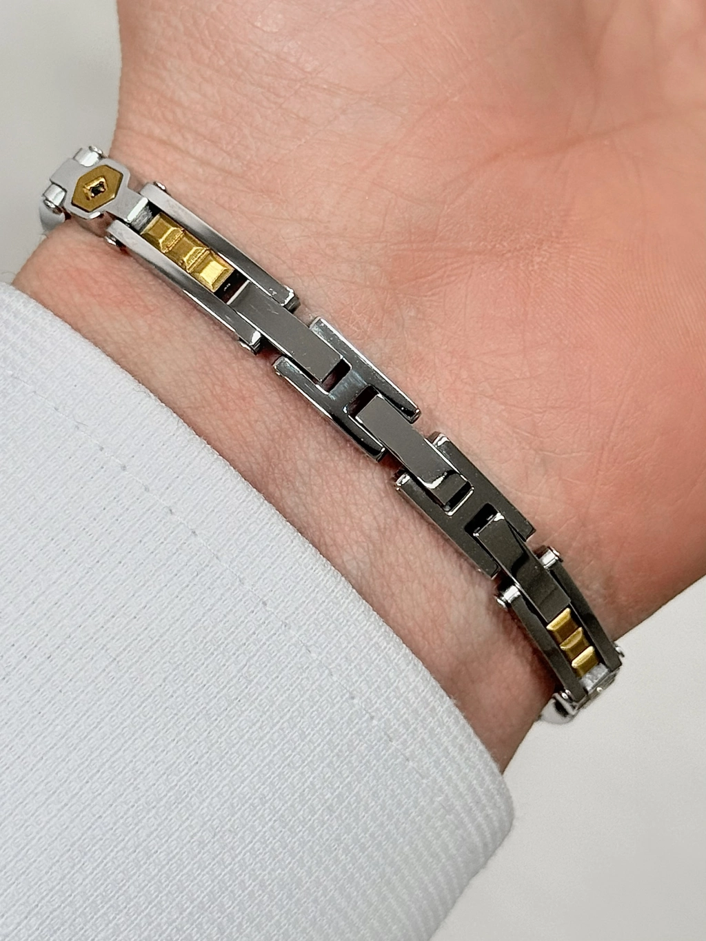 Paslanmaz çelikten üretilmiş bu şık model; sade ama dikkat çekici tasarımıyla her bilekte prestij sunar. Parlak yüzeyi ve sağlam yapısıyla hem görsel olarak güçlü hem de dayanıklı.
